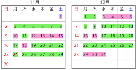 〇年末年始、お盆期間、祝日のある週は基本的に休みます。